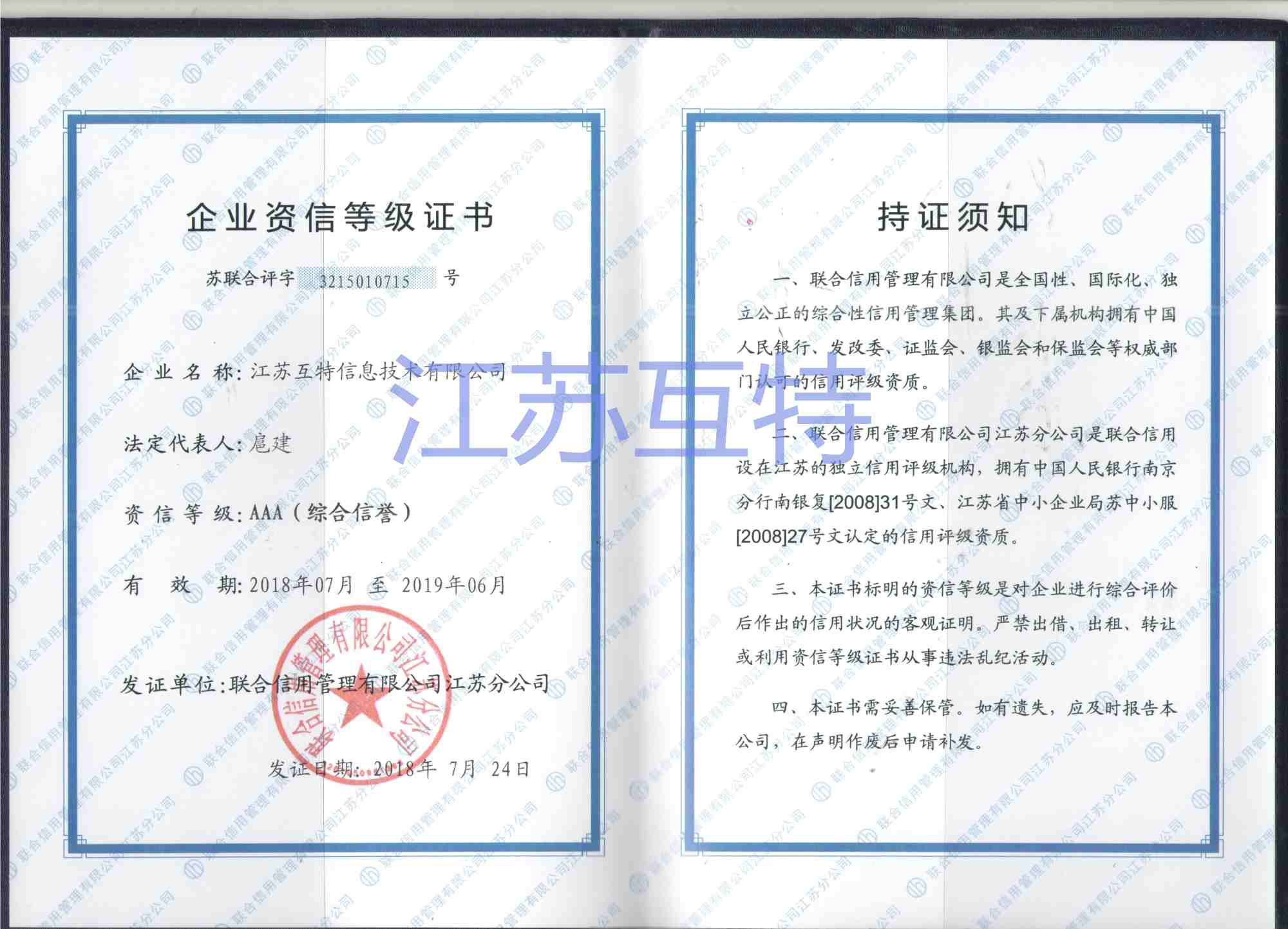 2018年7月24日,经过权威信用评审机构认证,江苏互特信息技术有限公司荣获“AAA级企业信用等级”证书,3A资信等级是评级公司对企业的经营情况,包括企业盈利能力,管理能力,发展前景等方面进行的综合评估,给出的最高信用评价,这标志着互特在规范运营,诚信经营上得到了国家相关部门及权威机构的一致认可!